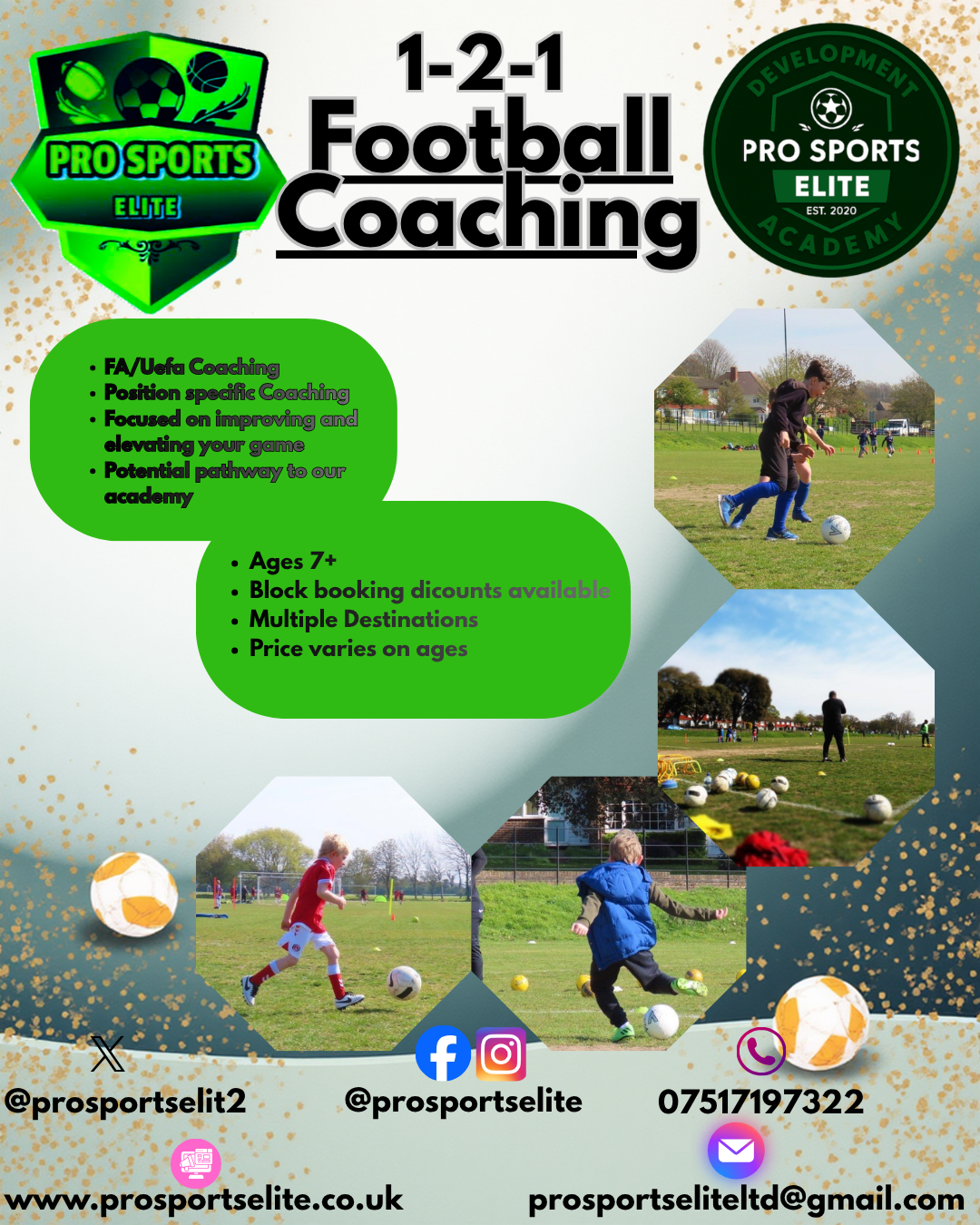 1-2-1 Coaching sessions are available for ages 7+ and focuses specifically on the needs you require to take your game to the next level. Prices vary.